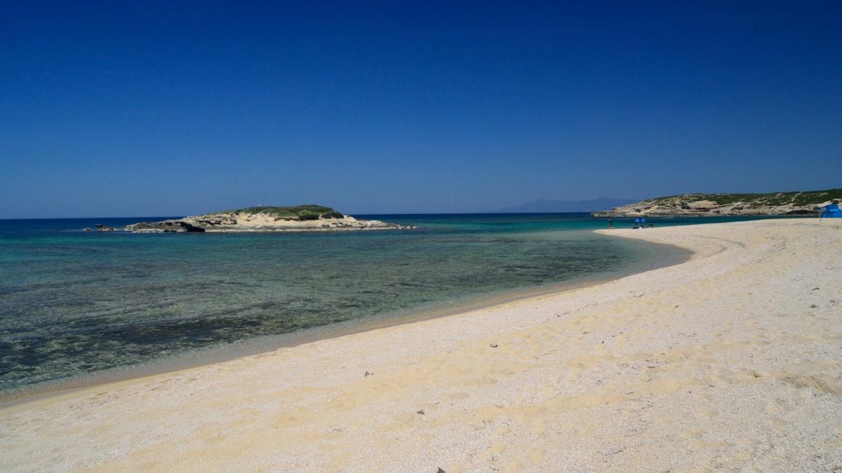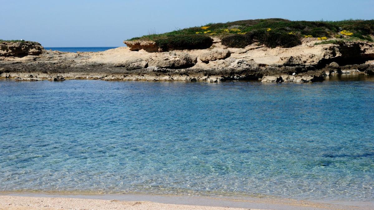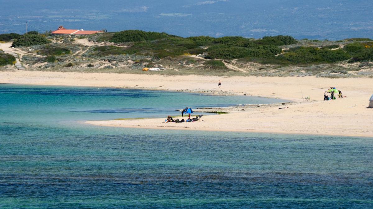 L’acqua è di color verde intenso e la spiaggia è circondata da dune popolate da piante mediterranee, la sabbia è fine e chiara.